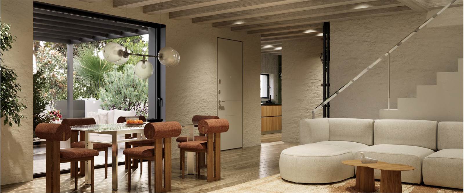 La porzione è così composta: ingresso su ampia zona giorno open space, luminosa e accogliente, arricchita da una grande vetrata scorrevole che si apre sul giardino esclusivo con pompeiana, ideale per pranzi all’aperto, relax o momenti in famiglia nelle giornate di sole. Cucina defilata con angolo cottura, funzionale e ben integrata, disimpegno e bagno. Saliamo le eleganti scale e troviamo la zona notte, composta da: ampia camera matrimoniale, due camere singole e ulteriore bagno.