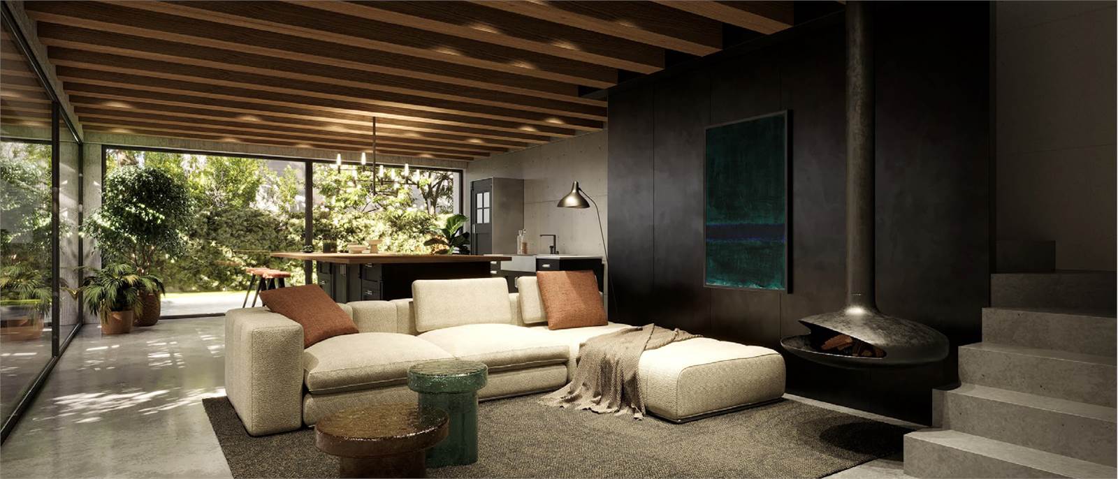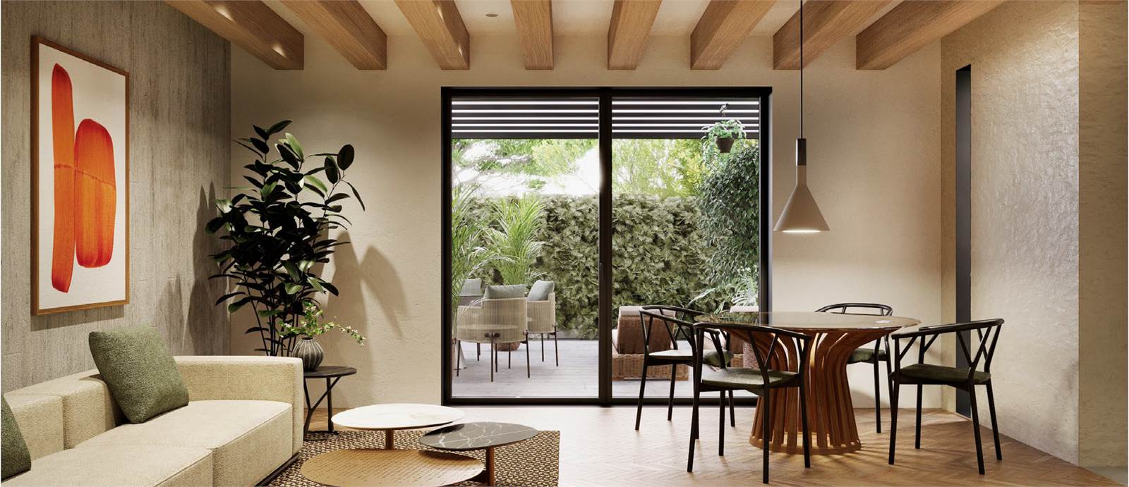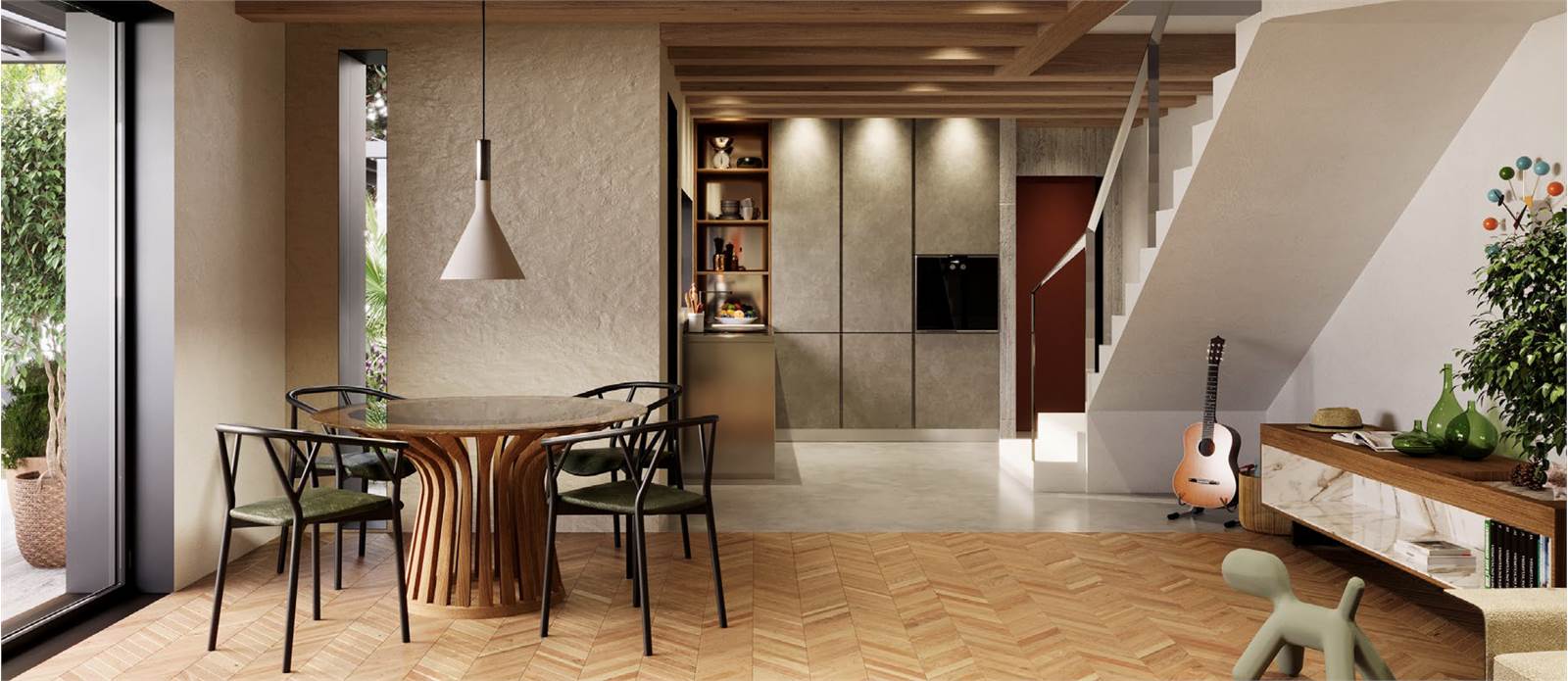 La porzione è così composta: ingresso su ampia zona giorno open space, luminosa e accogliente, arricchita da una grande vetrata scorrevole che si apre sul giardino esclusivo con pompeiana, ideale per pranzi all’aperto, relax o momenti in famiglia nelle giornate di sole. Cucina defilata con angolo cottura, funzionale e ben integrata, disimpegno e bagno. Saliamo le eleganti scale e troviamo la zona notte, composta da: ampia camera matrimoniale, due camere singole e ulteriore bagno.