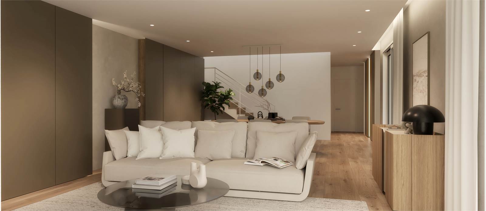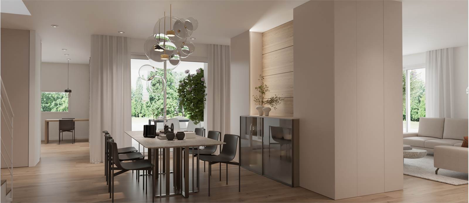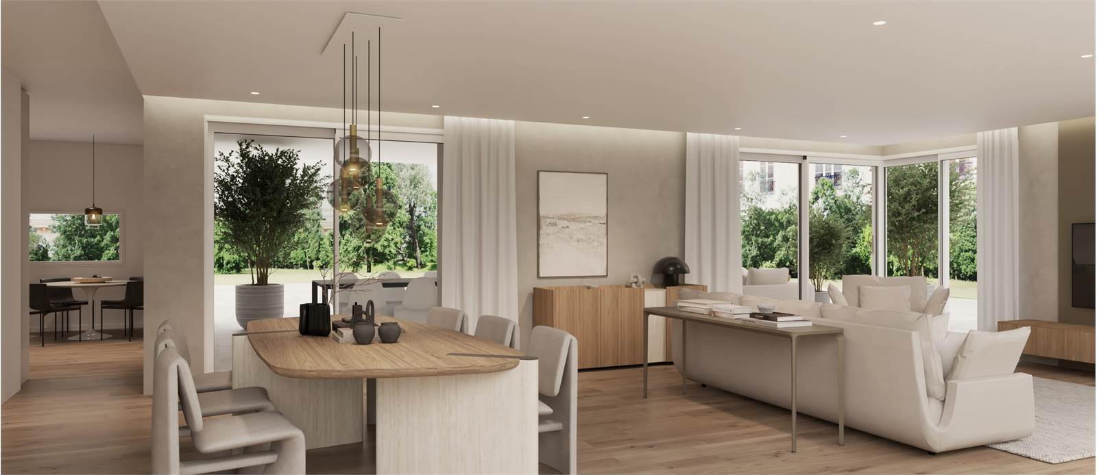 • Ampie zone living, caratterizzate da grandi superfici vetrate che si aprono sui giardini privati, regalando una luminosità unica e una sensazione di continuità tra interno ed esterno.